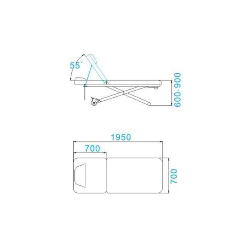 Zweiteilige Massageliege mit hoher Stabilität. Ausgestattet mit einem Motor zur elektrischen Höhenverstellung. Rückenlehne und Neigungsverstellung sind manuell einstellbar. Das Kopfkissen ist abnehmbar und verfügt über eine Belüftungsöffnung. Die Liege besitzt einen robusten Rahmen mit zwei Metallrollen für einfache Mobilität. Der Bezug besteht aus hochwertigem, pflegeleichtem, weißem PVC. Maximale Belastung: 150 kg.