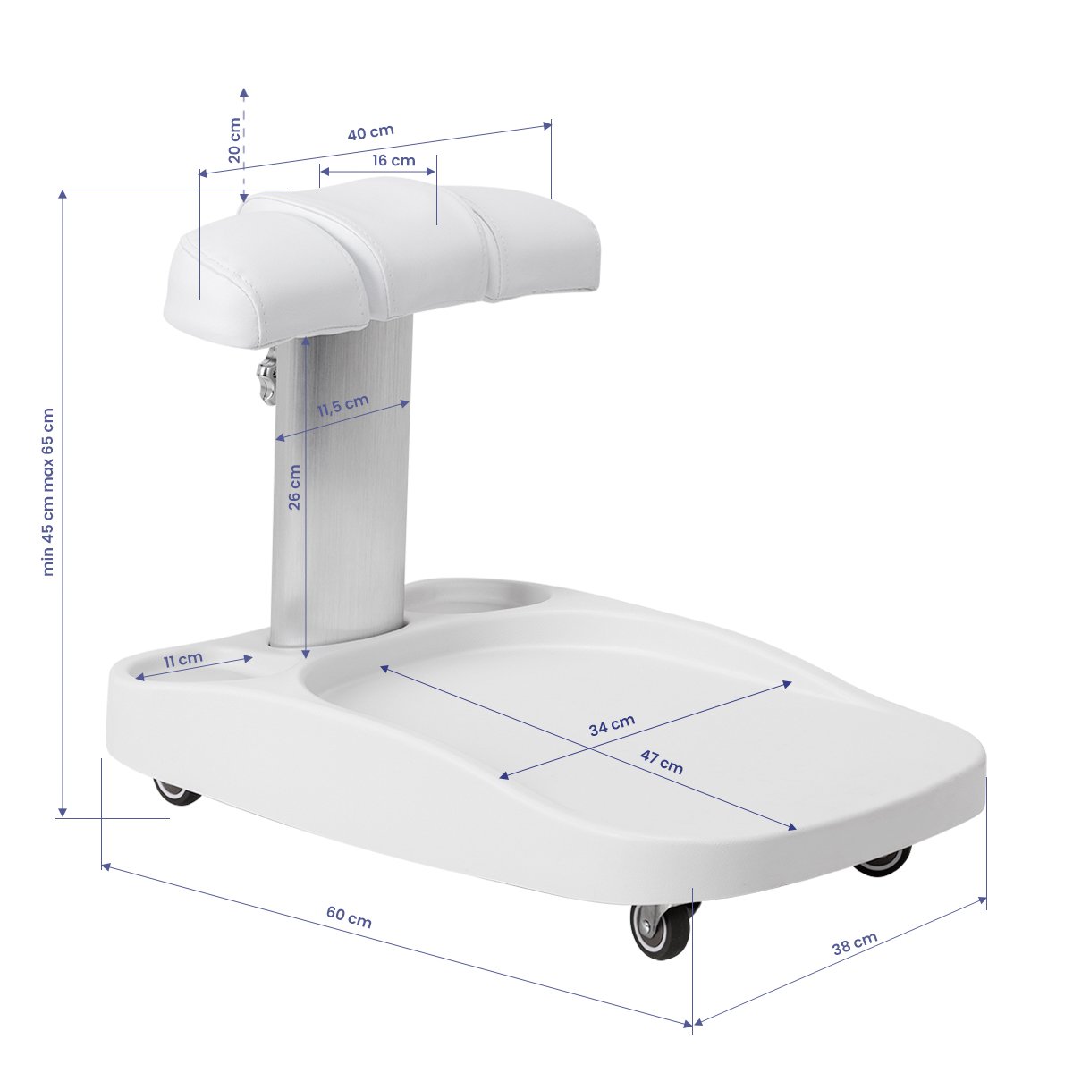 Die Marke Azzurro bietet hochwertige Kosmetikstühle und -liegen sowie multifunktionale Geräte wie z. B. Abtropfgestelle. Die professionelle Ausstattung findet unter anderem in Kosmetikstudios, podologischen Praxen, Massagestudios und Physiotherapiepraxen Anwendung. Komfort und Mobilität: Der Azzurro Duschwagen mit höhenverstellbarer Fußstütze ist ein unverzichtbares Ausstattungsstück in Kosmetik- und podologischen Praxen. Er erleichtert den Arbeitsalltag durch Mobilität und Ordnung am Arbeitsplatz. Die perfekte Lösung für alle, die Wert auf Komfort und Effizienz legen. Robuste Konstruktion und Funktionalität: Die Fußstütze besteht aus drei Elementen, von denen das mittlere ausziehbar ist. Die manuelle Höhenverstellung ermöglicht eine Anhebung um bis zu 20 cm. Alle Elemente der Fußstütze sind mit Kunstleder bezogen, was Feuchtigkeitsbeständigkeit und einfache Reinigung gewährleistet. Dadurch lässt sich der Wagen individuell an die Bedürfnisse des Nutzers anpassen und ist somit eine hervorragende Lösung. Der Azzurro Wagen ist sowohl für kosmetische als auch für podologische Behandlungen konzipiert und bietet Komfort und Präzision in verschiedenen Positionen. Stabilität, Langlebigkeit und Benutzerfreundlichkeit: Der Duschwagen Azzurro besticht durch seine robuste Kunststoffkonstruktion, die für Langlebigkeit und Stabilität sorgt. Feststellbare Gummiräder ermöglichen ein müheloses Manövrieren und machen ihn so funktional und komfortabel für den täglichen Gebrauch. Die Reinigung ist denkbar einfach – die Oberfläche ist fleckenabweisend. Der Duschwagen ist mit den meisten handelsüblichen Duschwannen kompatibel. Die Maße entnehmen Sie bitte dem Foto. Farbe: Weißtöne.