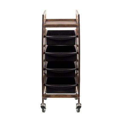Ein schwarzer Friseur-Arbeitsplatz. Seine stabile Konstruktion garantiert eine lange Lebensdauer. Der Tisch ist mit Gummirädern ausgestattet, sodass Ihre Werkzeuge stets griffbereit sind. Der Arbeitsplatz wird in Einzelteilen zur Selbstmontage geliefert. Verpackungsmaße: 50 x 53 x 18 cm.