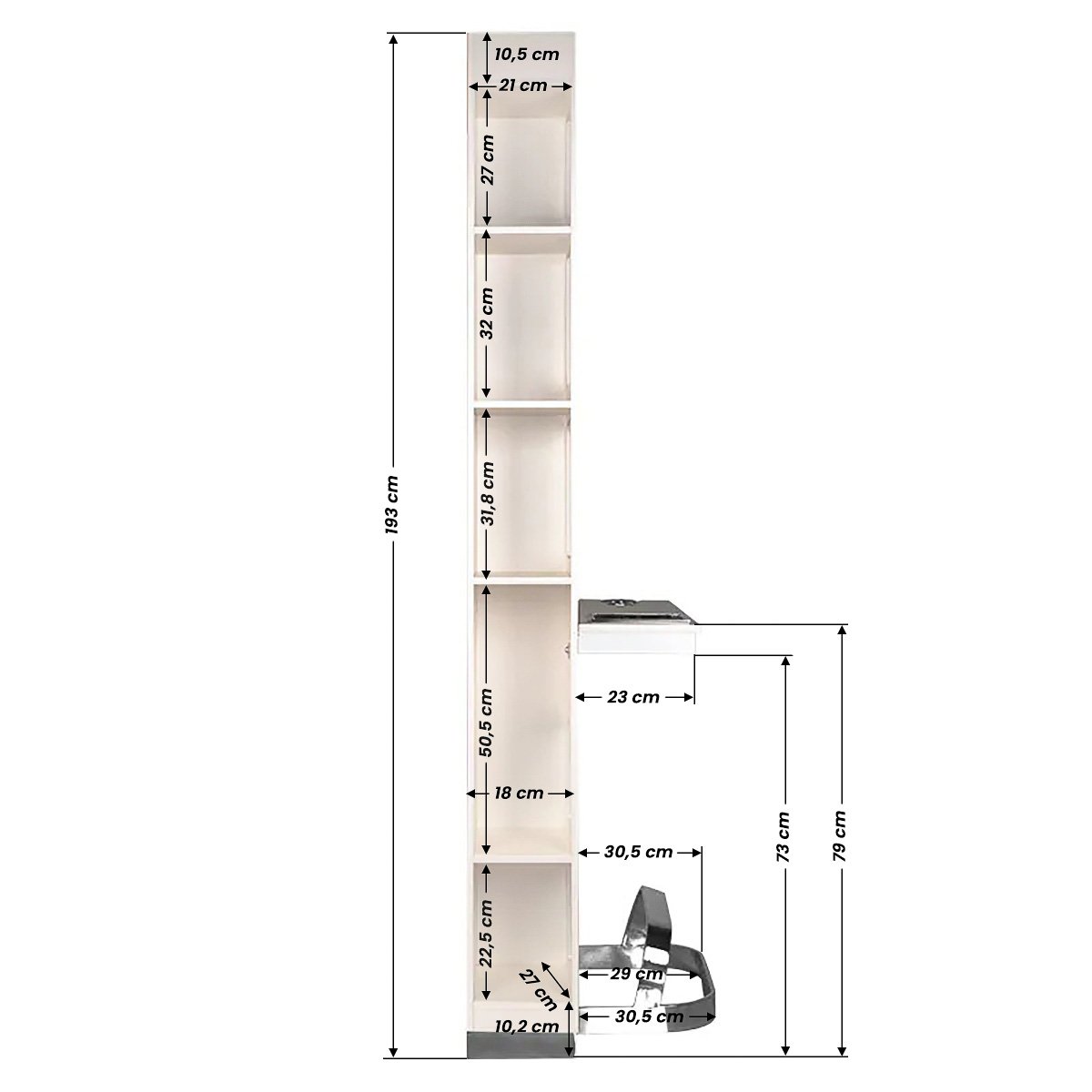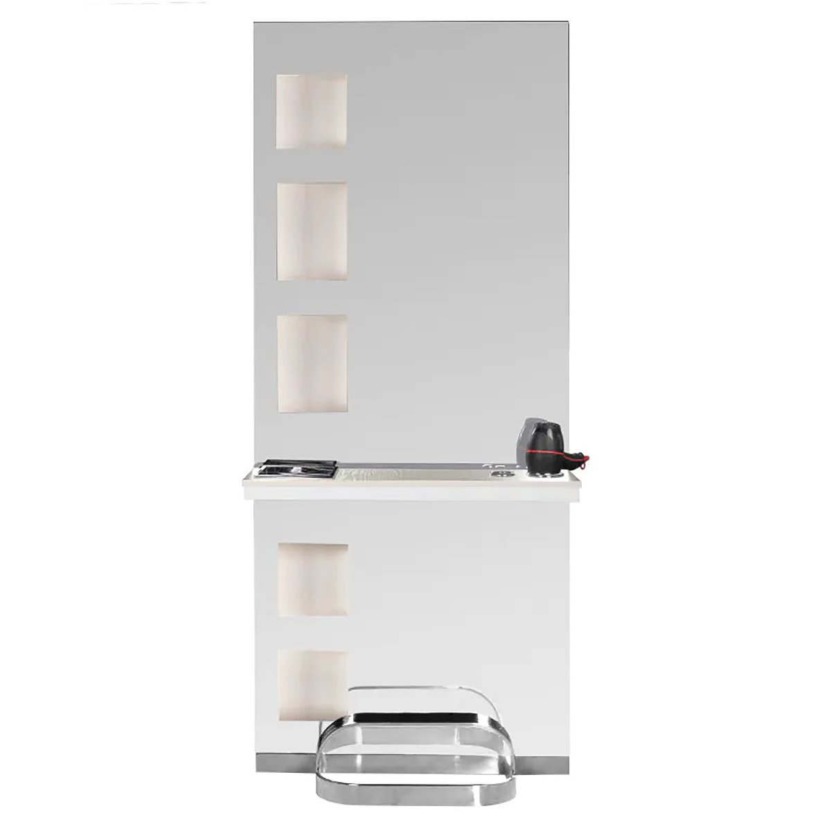 Ein moderner Friseurtisch mit großem Spiegel und praktischen Ablagen an beiden Seiten. Der Inhalt der Ablagen auf einer Seite ist durch die „Fenster“ sichtbar. Hochwertige Verarbeitung. Ein elegantes und zugleich vielseitiges Einrichtungselement, das jedem Salon ein besonderes Flair verleiht.