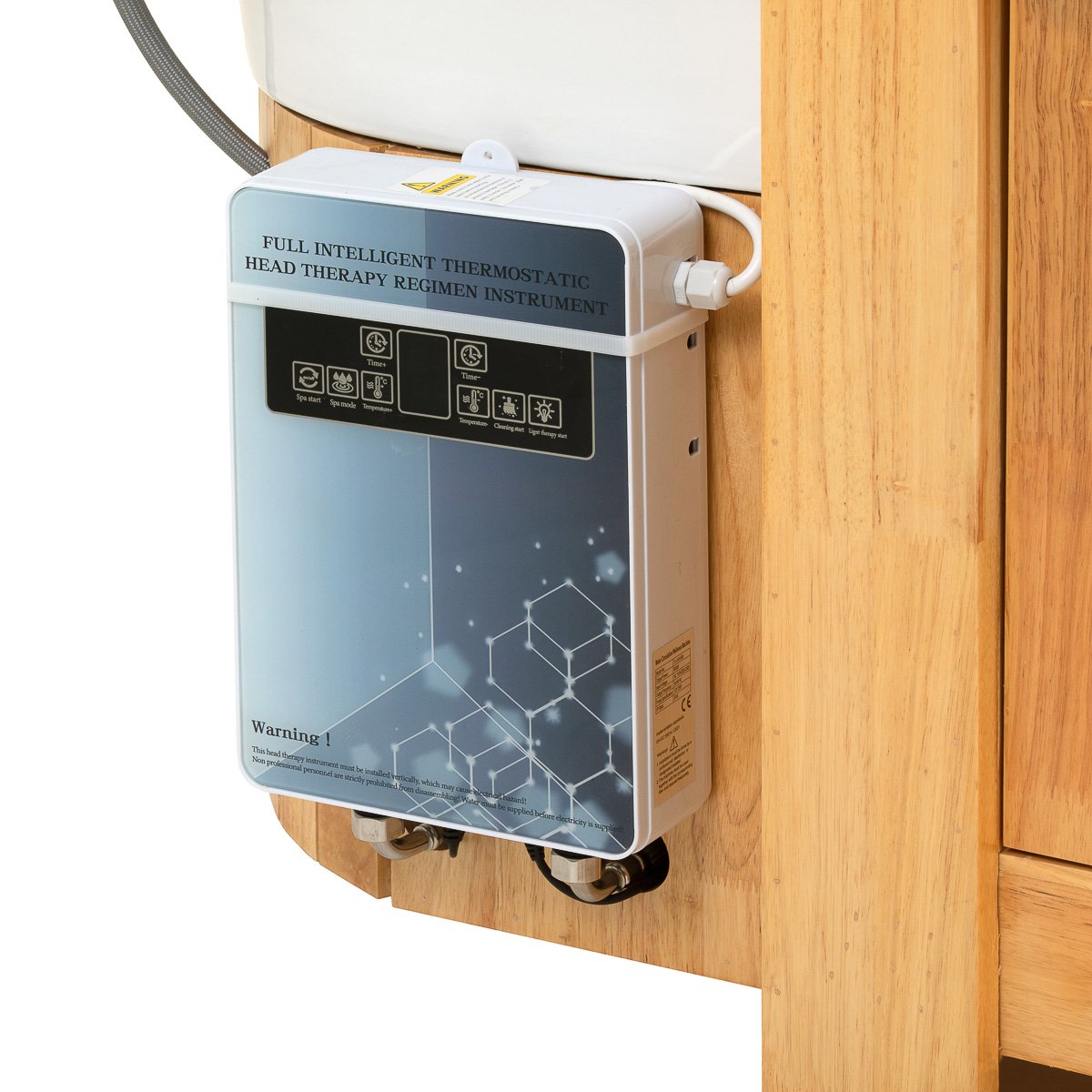 Gabbiano ist eine Luxusmarke für Friseurbedarf und -möbel, die sich durch Zuverlässigkeit, Qualität, ästhetische Verarbeitung und hohen Komfort auszeichnet. Das Sortiment umfasst eine große Auswahl an funktionaler Salonausstattung, darunter Sessel, Waschplätze und Infrarotzonen. Professionelle Liege für luxuriöse Kopf-SPA-Behandlungen. Die elegante Gabbiano Kopf-SPA-Liege Bali mit integriertem Waschplatz ist eine innovative Lösung für luxuriöse Schönheits- und Entspannungsbehandlungen. Sie eignet sich perfekt für japanische Kopf-SPA, Hydrotherapie, Wassermassage, Aromatherapie und Dampfbad und bietet ein ganzheitliches Pflegeerlebnis. Darüber hinaus ist sie auch für Körpermassagen geeignet und bietet vielseitige therapeutische und entspannende Möglichkeiten. Fortschrittliche Technologien und ergonomisches Design bieten nicht nur unvergleichlichen Komfort für Kunden, sondern erleichtern auch die Arbeit von Kosmetikern und Wellness-Experten. Die Kombination aus natürlicher Holzstruktur und weichem, braunem Bezug verleiht Eleganz und garantiert hohen Komfort. Was ist ein japanisches Kopf-SPA? Ein japanisches Kopf-SPA ist ein ganzheitliches Schönheitsritual, das Massage mit professioneller Kopfhaut- und Haarpflege kombiniert. Ziel ist es, den Hautzustand durch Anregung der Durchblutung, Entspannung der Muskulatur und Zufuhr essenzieller Nährstoffe zu verbessern. Die Behandlung nutzt Peelings, Masken, Essenzen und ätherische Öle, um die Haut von überschüssigem Talg und Unreinheiten zu befreien, intensiv mit Feuchtigkeit zu versorgen und die Mikrozirkulation anzuregen. Ein japanisches Kopf-SPA fördert Stressabbau, unterstützt gesundes Haarwachstum und verbessert den Haarzustand – für kräftigeres, geschmeidigeres und widerstandsfähigeres Haar. Neben der intensiven Pflege sorgt die Behandlung für tiefe Entspannung und macht Lust auf mehr. Luxuriöse Wasserfall-Kopf-SPA-Massage: Ein spezieller Bogen mit verstellbarem Winkel erzeugt einen Wasserfalleffekt, der die Kopfhaut intensiv reinigt und gleichzeitig als natürliche Massage wirkt. So werden die Durchblutung angeregt und Verspannungen sowie Stress abgebaut. Der präzise gesteuerte Wasserfluss unterstützt die Haarregeneration und spendet der Haut intensive Feuchtigkeit. Der verstellbare Wasserfall reinigt die Kopfhaut porentief und sorgt für Entspannung, wodurch Beschwerden wie Kopfschmerzen und Nackenverspannungen gelindert werden. Dank des intelligenten Kreislaufsystems wird das Wasser aus dem Becken wiederverwendet und ermöglicht so eine kontinuierliche Wassermassage. Wirksame Dampftherapie: Diese revolutionäre Haarpflegemethode nutzt die Eigenschaften von Dampf, um das Haar zu regenerieren und mit Feuchtigkeit zu versorgen. Das Set beinhaltet ein spezielles Dampfgerät und einen passenden Aufsatz für das Waschbecken, der eine präzise Dampfzufuhr ermöglicht. Dadurch können die Wirkstoffe von Masken, Ampullen und anderen Haarpflegeprodukten besser aufgenommen werden, was die Regeneration und Stärkung des Haares unterstützt. Die Dampftherapie verbessert die Haarstruktur, erhöht die Widerstandsfähigkeit gegen Haarschäden und verleiht dem Haar einen gesunden Glanz. Das Haar wird weicher, geschmeidiger und lebendiger. Touch-Bedienfeld: Das intuitive Touch-Bedienfeld ermöglicht die volle Kontrolle über die Behandlungsparameter und sorgt für hohen Bedienkomfort. Sie können die Behandlungsdauer und die Wassertemperatur einstellen sowie die Einstellungen kontinuierlich überwachen. Über das Bedienfeld lässt sich außerdem die Lichttherapie aktivieren – die Schale wird beleuchtet, wodurch eine entspannende Atmosphäre entsteht und der luxuriöse Charakter der Behandlung unterstrichen wird. Zusätzlich ist das Dampftherapiegerät mit einer Fernbedienung für die bequeme Bedienung ausgestattet. Funktionen für vielseitige Behandlungen: Eine verstellbare Kopfstütze mit ausziehbarer und neigbarer Neigung sorgt für eine optimale Anpassung an die Bedürfnisse des Benutzers und erhöht den Komfort während der Behandlung. Das Set umfasst ergonomische Kissen, darunter eine Kopfstütze mit Gesichtsöffnung, die neben Kopfbehandlungen auch Massagen sowie diverse Körper- und Gesichtsbehandlungen ermöglicht. Die integrierte Duschwanne erweitert die Funktionalität der Liege und erlaubt Fußbehandlungen, einschließlich Pediküren. Diese Lösung steigert das Entspannungsgefühl und ermöglicht ein noch umfassenderes Behandlungsangebot. Dank dieser praktischen Elemente wird die Liege zu einem universellen Ausstattungsstück für Kosmetik- und Wellnesssalons und garantiert sowohl Kundenkomfort als auch die Wirksamkeit der Behandlungen. Komfortable Anwendung: Das tiefe Keramikbecken in Weißtönen reduziert effektiv das Spritzen von Wasser und Behandlungsprodukten und sorgt so für Hygiene und Komfort. Das aus robustem Material gefertigte Becken ist beständig gegen Verfärbungen, Kratzer und Beschädigungen, und seine glatte Oberfläche ermöglicht eine besonders einfache Reinigung. Sein markantes Profil erleichtert nicht nur den Zugang für die behandelnde Person, sondern verleiht dem Waschplatz auch ein elegantes und modernes Aussehen. Die Kombination aus Ästhetik und Funktionalität hebt den Standard jedes professionellen Raumes. Durchdachte Ausstattung und Zubehör: Die Waschstation ist mit einer Mischbatterie ausgestattet, die eine einfache Temperaturregelung nach Kundenwunsch ermöglicht. Eine praktische Halterung für den Duschkopf erleichtert die Arbeit, und der Stöpsel mit speziellem Sieb ermöglicht die Kontrolle des Wasserdurchflusses und gewährleistet so hohe Hygienestandards im Salon. Der Wasseranschluss befindet sich im Becken und an der Rückseite unter der Duschwanne, was eine ästhetisch verdeckte Installation ermöglicht. Die ergonomisch geformte Liege bietet Komfort und optimale Unterstützung während der Behandlungen, und der mitgelieferte Hocker erhöht den Komfort des Personals. Di