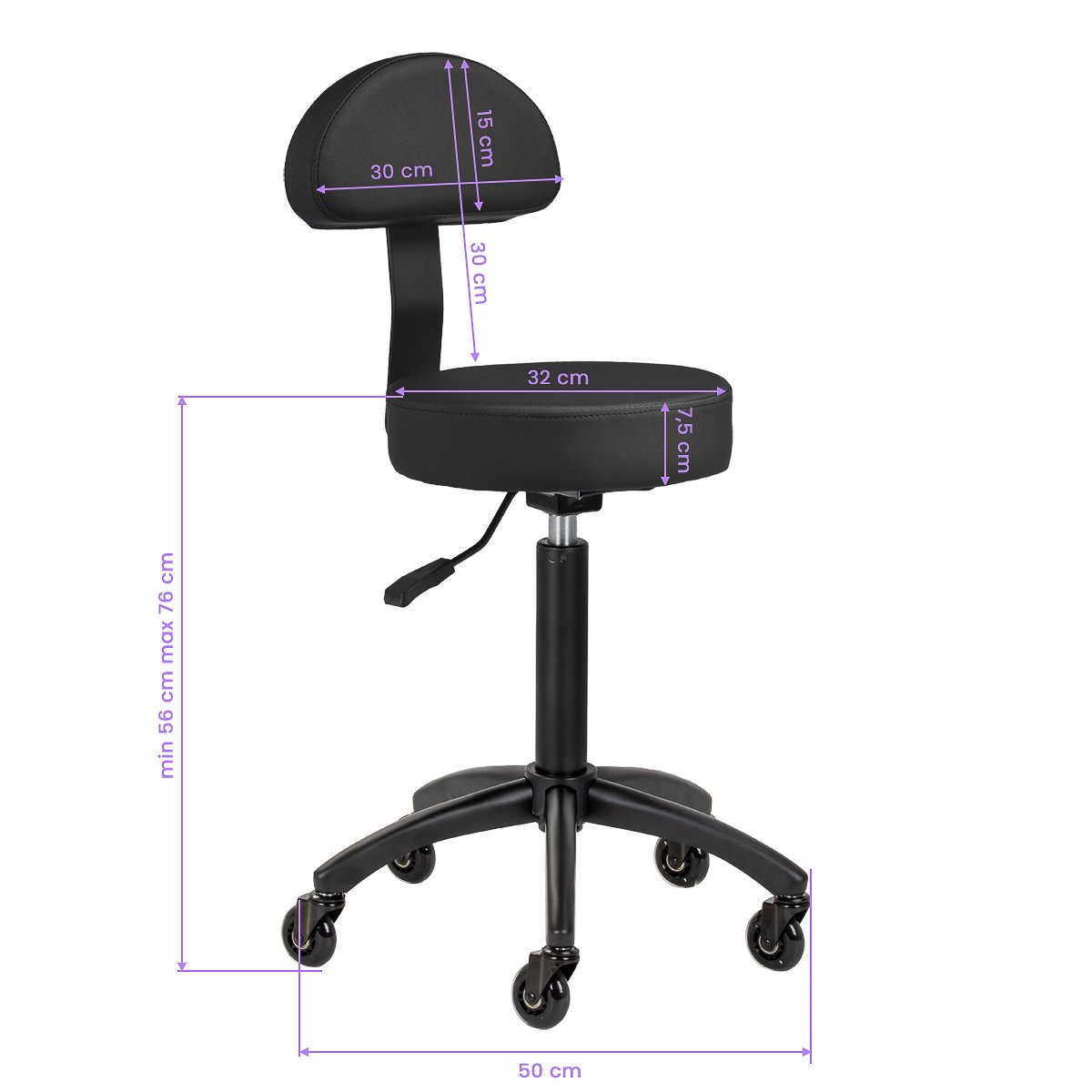 Gabbiano ist eine Luxusmarke für Friseurausstattung und -möbel, die sich durch Zuverlässigkeit, Qualität, ästhetische Verarbeitung und hohen Sitzkomfort auszeichnet. Das Sortiment umfasst eine große Auswahl an funktionaler Salonausstattung, darunter Sessel, Waschplätze und Infrarotzonen. Ergonomische Unterstützung für den Arbeitsalltag. Der praktische Friseurhocker Gabbiano D026 mit Rückenlehne wurde mit Blick auf Komfort und Ergonomie entwickelt. Die konturierte Rückenlehne unterstützt eine korrekte Haltung und entlastet die Wirbelsäule auch bei längeren Behandlungen. Die stabile Konstruktion in Kombination mit den leichtgängigen Rollen gewährleistet Bewegungsfreiheit und höchsten Komfort. Ergonomie und sanfte Bewegung. Die Sitzhöhenverstellung von 56 bis 76 cm ermöglicht eine individuelle Anpassung an die Bedürfnisse des Friseurs. Die Rückenlehne stützt die Wirbelsäule und sorgt so für Komfort auch bei längeren Arbeitsphasen. Der Drehmechanismus erhöht die Bewegungsfreiheit und damit den Komfort und die Effizienz. Die Roll Speed-Rollen mit Eisenkern und Gummibeschichtung gewährleisten die Mobilität. Der Hocker ist aus Polyurethan (PU) gefertigt, das sanfte Bewegungen mit außergewöhnlicher Verschleißfestigkeit vereint. ABEC-7-Kugellager ermöglichen ein müheloses Verschieben des Hockers und erleichtern so dessen Manövrierbarkeit erheblich. Stabile Basis und langlebige Materialien: Der Hocker steht auf einem fünfzackigen, schwarzen Fußkreuz mit seidenmatter Oberfläche, das auch bei intensiver Nutzung für hervorragende Stabilität sorgt. Der Sitz ist mit strapazierfähigem Kunstleder in eleganten Schwarztönen bezogen, das feuchtigkeits-, schmutz- und abriebfest ist. Die Schaumstoffpolsterung behält auch bei längerem Gebrauch ihre Form. Dank seines modernen, ästhetischen Designs passt der Hocker perfekt in professionelle Räumlichkeiten. Er ist eine praktische und elegante Wahl für Friseursalons, Kosmetikstudios und Büros, in denen Arbeitskomfort, solide Verarbeitung und stilvolle Einrichtung wichtig sind. Die Maße sind auf dem Foto dargestellt. Höhenverstellung: Gasdruckfeder. Bezugsfarbe: Schwarztöne. Fußkreuzfarbe: Schwarztöne.