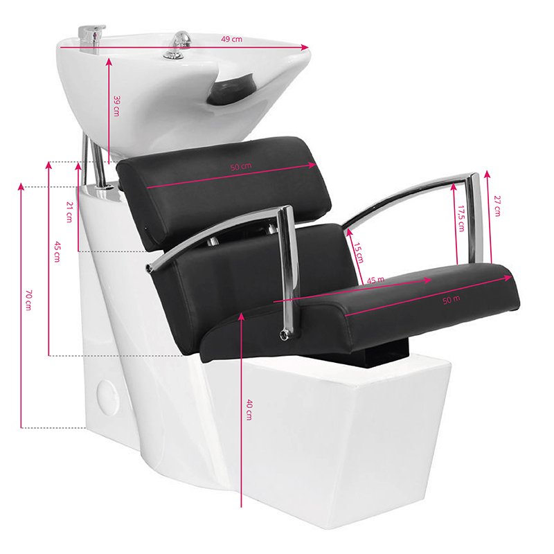 Professioneller Friseurwaschtisch – stabil, äußerst komfortabel und solide verarbeitet. Sein modernes Design macht ihn zu einer attraktiven Ergänzung für jeden modernen Friseursalon. Der Sitz ist aus hochwertigem, schwarzem Kunstleder gefertigt. Eine Silikon-Kopfstütze stabilisiert den Kopf des Kunden und ermöglicht eine bequeme Positionierung. Der Waschtisch ist weiß und neigungsverstellbar.