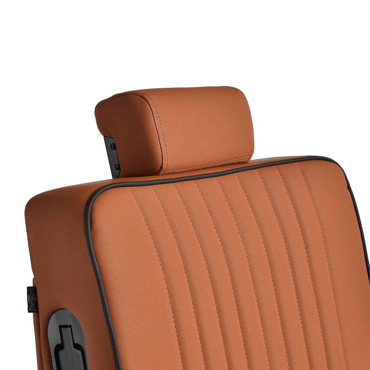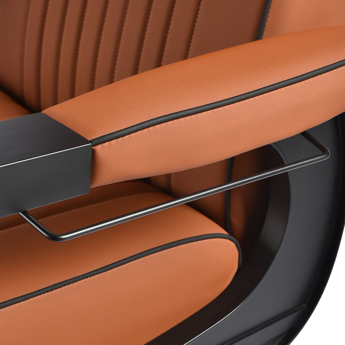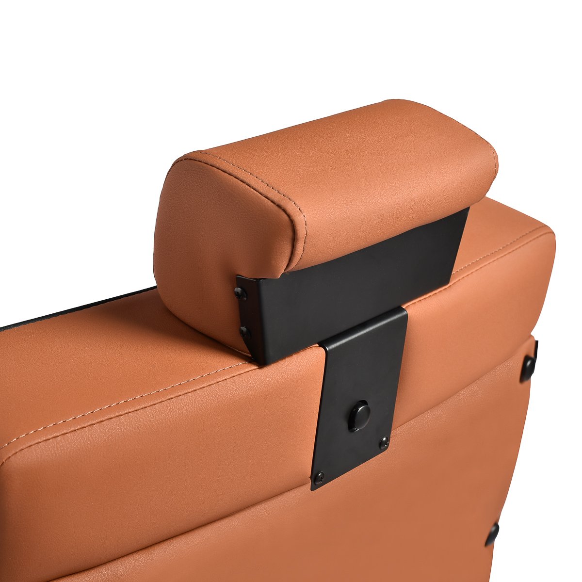 Gabbiano ist eine Luxusmarke für Friseurausstattung und -möbel, die sich durch Zuverlässigkeit, Qualität, ästhetische Verarbeitung und hohen Sitzkomfort auszeichnet. Das Unternehmen bietet eine große Auswahl an funktionaler Salonausstattung, darunter Sessel, Waschplätze und Infrarotzonen. Der elegante Gabbiano Levi Friseurstuhl vereint Stil und Funktionalität. Ausgestattet mit einer robusten hydraulischen Höhenverstellung, verstellbarer Rückenlehne, Fußstütze und ausziehbarer Kopfstütze ermöglicht er eine individuelle Positionierung für jede Behandlung. Dies garantiert maximalen Komfort für Kunde und Friseur. Sorgfältig verarbeitete Details, vertikale Ziernähte und ein elegantes Finish machen den Stuhl zu einer attraktiven Ergänzung für jeden Friseursalon. Umfangreiche Einstellmöglichkeiten: Die effiziente hydraulische Höhenverstellung ermöglicht eine stufenlose Sitzhöhenverstellung von 60 bis 76 cm, selbst wenn der Kunde bereits sitzt. So lässt sich der Stuhl ergonomisch an die Körpergröße des Kunden und die Vorlieben des Friseurs anpassen. Der intuitive Seitenmechanismus ermöglicht ein einfaches Zurücklehnen von Rückenlehne und Fußstütze in eine halbliegende Position und sorgt so für Komfort bei präzisen Behandlungen. Die ausziehbare Kopfstütze bietet zusätzlichen Halt und erhöht so den Sitzkomfort. Komfortmerkmale: Der mit weichem Schaumstoff gepolsterte Sitz sorgt auch bei längeren Behandlungen für bequemes Sitzen, während die ergonomisch geformte Rückenlehne den Rücken optimal stützt. Der Drehmechanismus ermöglicht maximale Bewegungsfreiheit und uneingeschränkten Zugang von allen Seiten und erleichtert so die Arbeit des Stylisten. Die gepolsterten Armlehnen in optimaler Höhe unterstützen die natürliche Armhaltung und reduzieren so Verspannungen in Schultern und Nacken. Ein praktischer Handtuchhalter unter der linken Armlehne erleichtert die Organisation des Arbeitsplatzes. Elegantes Design und hohe Funktionalität: Das schwarze, runde Fußkreuz garantiert Stabilität und Langlebigkeit. Der Bezug aus weichem, mattem Kunstleder vereint Komfort und Strapazierfähigkeit. Die verwendeten Materialien sind feuchtigkeitsbeständig, langlebig und pflegeleicht. Stilvolle Ziernähte und der Bezug in Brauntönen verleihen dem Stuhl einen einzigartigen Charakter und passen perfekt zur Einrichtung moderner Barbershops. Die Kombination aus elegantem Bezugston und schwarzem Gestell unterstreicht den modernen, professionellen Look. Detaillierte Maße finden Sie auf dem Foto. Das Set beinhaltet: Sitz, Stellantrieb mit Basis, Kopfstütze. Details: Hub: hydraulisch; Basis: rund; Bezugsmaterial: Kunstleder; Bezugsfarbe: Brauntöne; Rahmenfarbe: Schwarztöne