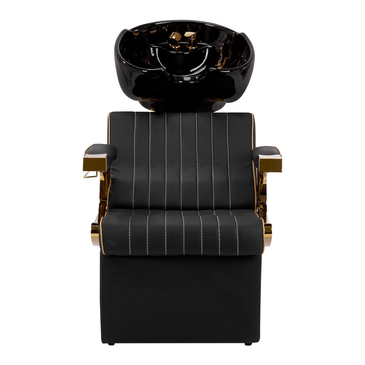 Gabbiano ist eine Luxusmarke für Friseurausstattung und -möbel, die sich durch Zuverlässigkeit, Qualität, ästhetische Verarbeitung und hohen Bedienkomfort auszeichnet. Das Sortiment umfasst eine große Auswahl an funktionaler Salonausstattung, darunter Sessel, Waschplätze und Infrarotzonen. Der beeindruckende Gabbiano Marcus Waschplatz, ein stilvolles Element im Friseursalon, optimiert die Arbeitsabläufe und erleichtert grundlegende Haarbehandlungen wie Waschen, Färben und Pflegen. Das integrierte Design sorgt für Komfort für Friseure und Kunden, während der optisch ansprechende Sessel und die dekorativen, polierten Elemente dem Interieur eine einzigartige Note verleihen. Ein elegantes Waschbecken für mehr Komfort. Das optisch ansprechende, schwarze Keramikwaschbecken mit seiner optimalen Tiefe optimiert die Behandlungen, indem es übermäßiges Spritzen von Wasser oder Produkten verhindert. Dies ermöglicht die komfortable und effiziente Durchführung einer Vielzahl von Dienstleistungen. Der Winkel des Beckens ist verstellbar und lässt sich so individuell anpassen. Das hochwertige Material macht das Waschbecken langlebig, farbbeständig, kratzfest und sehr leicht zu reinigen. Die angewinkelte Rückenlehne und der ergonomisch geformte Kragen bieten optimalen Halt und Komfort beim Haarewaschen. Perfekte Ausstattung für vollkommene Entspannung. Das Waschbecken ist mit einer Mischbatterie ausgestattet, die den einfachen Zugriff auf Warm- und Kaltwasser ermöglicht. So lässt sich die Temperatur individuell an die Kundenwünsche anpassen. Eine praktische Halterung für die Handbrause erleichtert die Arbeit, während ein verchromter Stöpsel mit speziellem Sieb die Wassermenge reguliert und so für hohe Hygienestandards im Salon sorgt. Der Wasseranschluss befindet sich an der Rückseite in einem ästhetisch ansprechenden, goldfarbenen Element, wodurch alle Leitungen elegant verdeckt werden. Das Waschbecken ist ergonomisch geformt und bietet Komfort bei verschiedenen Behandlungen. Ein Handtuchhalter, der unter der Armlehne angebracht werden kann, optimiert den Arbeitsablauf. Funktionale Möbel mit dekorativem Design. Ein ergonomisch geformter Sessel mit strapazierfähiger Schaumstoffpolsterung bietet Lendenwirbelstütze und hohen Sitzkomfort. Teilweise gepolsterte, dekorative Armlehnen ermöglichen eine optimale Arm- und Schulterpositionierung. Der Kunstlederbezug in Schwarztönen mit ästhetischen weißen Ziernähten garantiert Langlebigkeit und einfache Reinigung. Die originelle und elegante Optik der Autowaschanlage verleiht jedem Innenraum eine besondere Note, während der formschöne Sockel und die Beine für Stabilität sorgen. Das Set beinhaltet alle Armaturen in Goldtönen, darunter Wasserhahn, Duschkopf und passende Schläuche – alles, was Sie für die Autowäsche benötigen. Detaillierte Maße finden Sie auf dem Foto. Material des Beckens: Keramik. Farbe des Beckens: Schwarztöne. Farbe des Bezugs: Schwarztöne. Farbe des Sockels: Schwarztöne. Farbe der Armaturen: Goldtöne. Bezugsmaterial: Kunstleder. Die Goldelemente sind lackiert. Mechanische Beschädigungen der Oberfläche sind von der Garantie ausgeschlossen.
