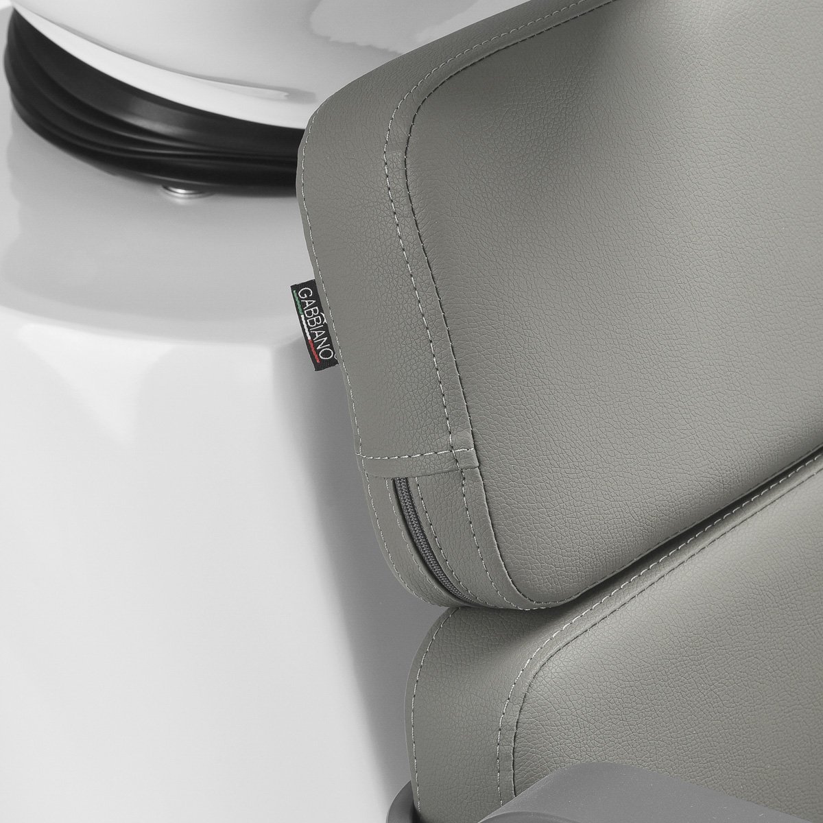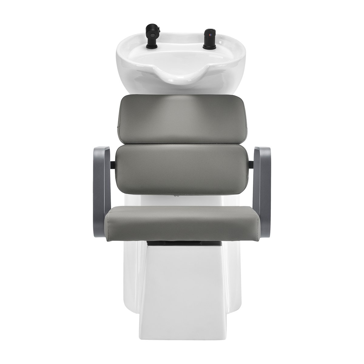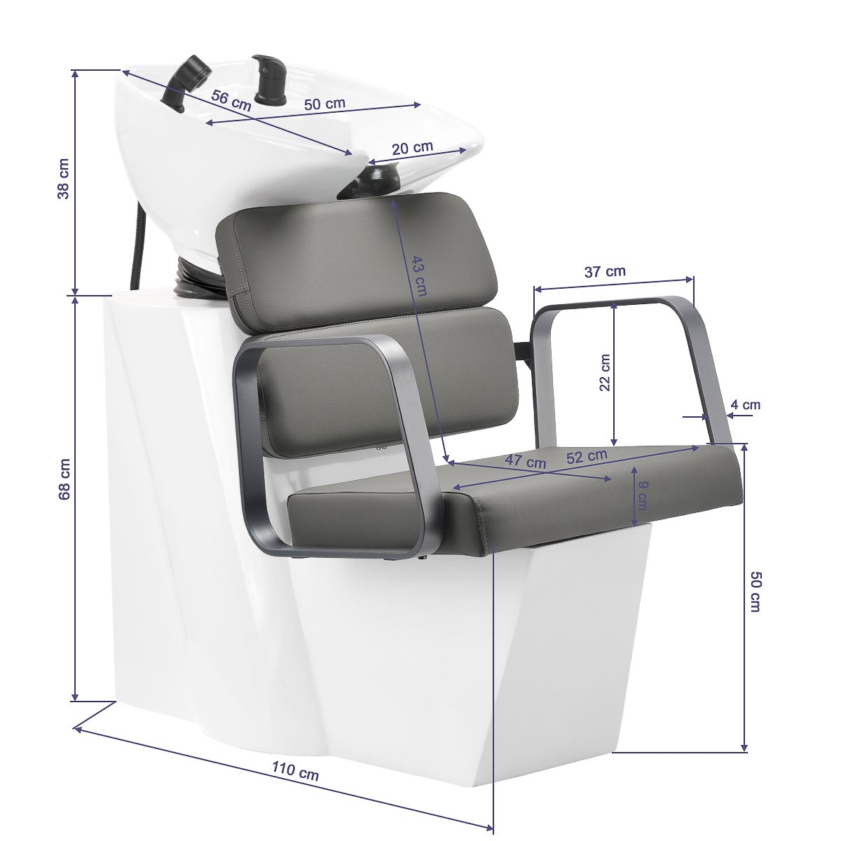 Gabbiano ist eine Luxusmarke für Friseurausstattung und -möbel, die sich durch Zuverlässigkeit, Qualität, ästhetische Verarbeitung und hohen Bedienkomfort auszeichnet. Das Sortiment umfasst eine große Auswahl an funktionaler Salonausstattung, darunter Sessel, Waschplätze und Infrarotzonen. Der elegante Gabbiano Porto Waschplatz ist ein stilvolles Element für jeden Friseursalon und wurde mit Blick auf die praktischen Bedürfnisse professioneller Friseure entwickelt. Er optimiert grundlegende Haarbehandlungen wie Waschen, Färben und Pflegen. Das integrierte Design sorgt für Komfort für Friseure und Kunden, während der optisch ansprechende Sessel dem Interieur eine besondere Note verleiht. Ein stilvolles Waschbecken für mehr Komfort. Die optimale Tiefe des weißen Keramikbeckens verhindert übermäßiges Spritzen von Wasser oder Pflegeprodukten und ermöglicht so die komfortable und effiziente Durchführung verschiedenster Dienstleistungen. Der Winkel des Beckens ist verstellbar und lässt sich so individuell anpassen. Die hochwertigen Materialien machen das Waschbecken langlebig, farbbeständig, kratzfest und besonders pflegeleicht. Der konturierte Kragen und die angewinkelte Rückenlehne bieten Halt und Komfort beim Haarewaschen. Dank der komfortablen schwarzen Kunststoffabdeckung spüren Kunden die kühle Keramikoberfläche nicht. Praktisch: Dieses Waschbecken ist mit einer Mischbatterie ausgestattet, die den einfachen Zugriff auf warmes und kaltes Wasser ermöglicht. So lässt sich die Temperatur individuell an die Kundenwünsche anpassen. Eine praktische Halterung für den Handbrausekopf optimiert die Arbeitsabläufe, während ein verchromter Stöpsel mit speziellem Sieb die Wassermenge reguliert und hohe Hygienestandards im Salon gewährleistet. Der Wasseranschluss befindet sich im Sockel und ermöglicht so eine effiziente Verlegung der Leitungen. Ein weiterer Vorteil dieses Modells ist die Öffnung zwischen Rückenlehne und Sitzfläche. Sie erleichtert die Reinigung im Salon, da Schmutz von jeder Ecke des Stuhls einfach entfernt werden kann. Die Waschstation ist ergonomisch geformt und bietet Komfort bei verschiedenen Behandlungen sowie optimale Rückenunterstützung. Die Kombination aus Funktionalität und Komfort macht die Arbeit im Friseursalon noch angenehmer. Funktionale Möbel in modernem Design. Der konturierte Sessel bietet optimale Lendenwirbelstütze und sorgt so für hohen Sitzkomfort. Geometrisch geformte Metallarmlehnen in Grautönen sorgen für eine optimale Schulterhaltung. Strapazierfähige, formstabile Schaumstoffpolsterung und ein weicher Kunstlederbezug in Grautönen garantieren Langlebigkeit, einfache Reinigung und dauerhaften Komfort. Das originelle, elegante Design der Waschstation verleiht jedem Interieur eine besondere Note. Das Set beinhaltet alle Armaturen in Schwarztönen, darunter Wasserhahn, Duschkopf und passende Schläuche – alles, was Sie für die tägliche Reinigung benötigen. Detaillierte Maße finden Sie auf dem Foto. Material des Beckens: Keramik. Farbe des Beckens: Weißtöne. Farbe des Bezugs: Grautöne. Farbe der Metallelemente: Grautöne. Farbe des Gestells: Weißtöne. Farbe der Armaturen: Schwarztöne. Bezugsmaterial: Kunstleder.