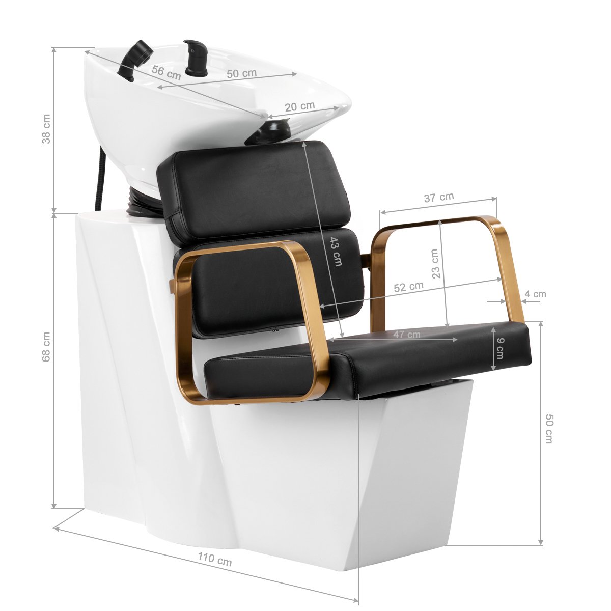 Gabbiano ist eine Luxusmarke für Friseurausstattung und -möbel, die sich durch Zuverlässigkeit, Qualität, ästhetische Verarbeitung und hohen Bedienkomfort auszeichnet. Das Unternehmen bietet eine große Auswahl an funktionaler Salonausstattung, darunter Sessel, Waschplätze und Infrarotzonen. Der elegante Gabbiano Porto-GM Friseurwaschplatz, ein stilvolles Element für jeden Friseursalon, wurde mit Blick auf die praktischen Bedürfnisse professioneller Friseursalons entwickelt. Er optimiert grundlegende Haarbehandlungen wie Waschen, Färben und Pflegen. Das integrierte Design sorgt für Komfort für Friseure und Kunden, während der optisch ansprechende Sessel dem Interieur eine besondere Note verleiht. Ein stilvolles Waschbecken für mehr Komfort. Die optimale Tiefe des weißen Keramikbeckens verhindert übermäßiges Spritzen von Wasser oder Pflegeprodukten und ermöglicht so die komfortable und effiziente Durchführung einer Vielzahl von Dienstleistungen. Der Winkel des Beckens ist verstellbar und lässt sich so individuell anpassen. Die hochwertigen Materialien machen das Waschbecken langlebig, farbbeständig, kratzfest und besonders pflegeleicht. Der konturierte Kragen und die angewinkelte Rückenlehne bieten Halt und Komfort beim Haarewaschen. Dank der komfortablen schwarzen Kunststoffabdeckung spüren Kunden die kühle Keramikoberfläche nicht. Praktisch: Dieses Waschbecken ist mit einer Mischbatterie ausgestattet, die den einfachen Zugriff auf warmes und kaltes Wasser ermöglicht. So lässt sich die Temperatur individuell an die Kundenwünsche anpassen. Eine praktische Halterung für den Handbrausekopf optimiert die Arbeitsabläufe, während ein verchromter Stöpsel mit speziellem Sieb die Wassermenge reguliert und hohe Hygienestandards im Salon gewährleistet. Der Wasseranschluss befindet sich im Sockel und ermöglicht so eine effiziente Verlegung der Leitungen. Ein weiterer Vorteil dieses Modells ist die Öffnung zwischen Rückenlehne und Sitzfläche. Sie erleichtert die Reinigung im Salon, da Schmutz von jeder Ecke des Stuhls einfach entfernt werden kann. Die Waschstation ist ergonomisch geformt und bietet Komfort bei verschiedenen Behandlungen sowie optimale Rückenunterstützung. Die Kombination aus Funktionalität und Komfort macht die Arbeit im Friseursalon noch angenehmer. Funktionale Möbel in modernem Design. Der konturierte Sessel bietet optimale Lendenwirbelstütze und sorgt so für hohen Sitzkomfort. Geometrisch geformte Armlehnen aus Metall in Goldtönen ermöglichen eine optimale Schulterposition. Die strapazierfähige, formstabile Schaumstoffpolsterung und der Bezug aus weichem Kunstleder in Schwarztönen garantieren Langlebigkeit, einfache Reinigung und dauerhaften Komfort. Das originelle, elegante Design der Waschstation verleiht jedem Interieur eine besondere Note. Das Set beinhaltet alle Armaturen in Schwarztönen, darunter Wasserhahn, Duschkopf und passende Schläuche – alles, was Sie für die tägliche Körperpflege benötigen. Detaillierte Maße finden Sie auf dem Foto. Material Becken: Keramik. Farbe Becken: Weißtöne. Farbe Bezug: Schwarztöne. Farbe Metallelemente: Goldtöne. Farbe Gestell: Weißtöne. Farbe Armaturen: Schwarztöne. Bezugsmaterial: Kunstleder. Verpackungsmaße: Höhe 110 cm, Länge 117 cm, Breite 69 cm. Die Goldelemente sind lackiert. Mechanische Beschädigungen der Lackierung sind von der Reklamation ausgeschlossen.