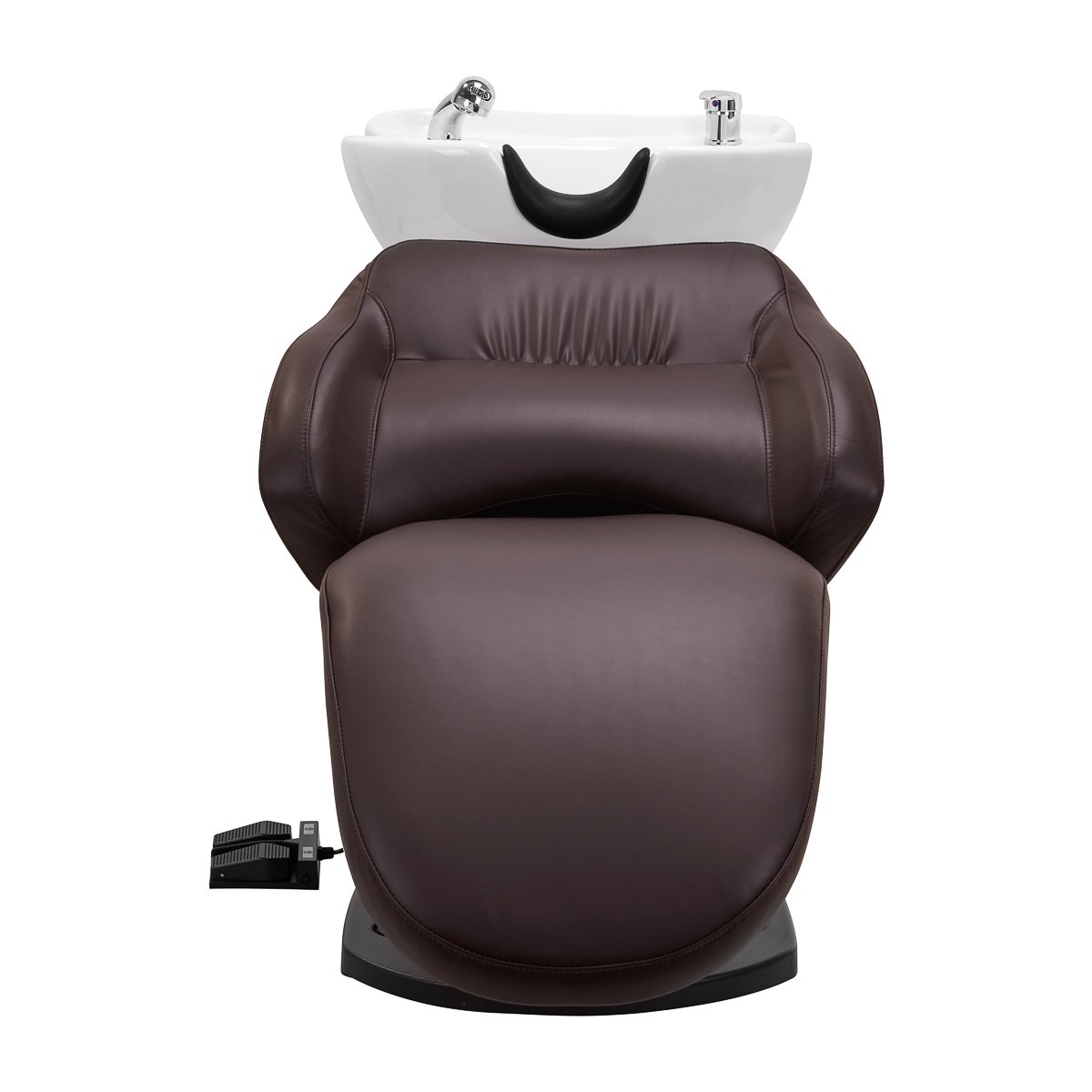 Gabbiano ist eine Luxusmarke für Friseurausstattung und -möbel, die sich durch Zuverlässigkeit, Qualität, ästhetische Verarbeitung und hohen Bedienkomfort auszeichnet. Das Sortiment umfasst eine große Auswahl an funktionaler Salonausstattung, darunter Sessel, Waschplätze und Infrarotzonen. Ein professioneller Waschplatz für maximalen Komfort. Der elektrische Friseurwaschplatz Gabbiano TRYCHO ermöglicht komfortables Haarewaschen und bietet die Möglichkeit, die Position individuell an die Bedürfnisse des Kunden anzupassen. Einfache Bedienung und hoher Komfort gewährleisten effizientes Arbeiten. Anpassungsfähig an die Bedürfnisse: Rückenlehne und Fußstütze lassen sich per elektrischem Stellantrieb synchron verstellen und bieten so eine ergonomische Position, die auf die Bedürfnisse des Kunden abgestimmt ist. Der Waschplatz kann in eine Liegeposition gebracht werden und garantiert so optimale Unterstützung für Rücken und Beine. Dies reduziert Muskelverspannungen und sorgt für Komfort auch bei längeren Behandlungen. Die Neigungswinkel werden über ein Fußpedal gesteuert – der entsprechende Knopf kann angehoben oder abgesenkt werden. Diese Lösung bietet nicht nur außergewöhnlichen Komfort, sondern auch hohe Funktionalität und stellt sicher, dass unsere Produkte selbst die anspruchsvollsten Kunden zufriedenstellen. Ein stilvolles Waschbecken für einfache Handhabung. Das tiefe Keramikwaschbecken in Weißtönen ermöglicht die komfortable und effiziente Durchführung verschiedenster Friseurdienstleistungen und verhindert übermäßiges Spritzen von Wasser und Pflegeprodukten. Das verwendete Material macht das Waschbecken langlebig, farbbeständig, kratzfest und besonders pflegeleicht. Ein ergonomisch geformter Rand sorgt für Komfort beim Haarewaschen. Eine spezielle Kopfstütze im Becken gewährleistet optimale Unterstützung und verhindert, dass das Gewicht des Kopfes auf dem Nacken lastet. Diese innovative Lösung beugt Verspannungen und Beschwerden im Nackenbereich vor und sorgt für hohen Komfort, auch bei längeren Behandlungen. Dank des komfortablen schwarzen Kunststoffdeckels spüren Kunden die kühle Keramikoberfläche nicht. Optimale Ausstattung: Die Wascheinheit ist mit einer Mischbatterie ausgestattet, die jederzeit Zugang zu Warm- und Kaltwasser bietet. So lässt sich die Temperatur einfach an die Kundenwünsche anpassen. Ein Duschkopf mit 120 cm langem Schlauch und ein praktisches Ablagefach erleichtern die Arbeit, während ein verchromter Stöpsel mit speziellem Sieb die Wassermenge reguliert und so für hohe Hygienestandards im Salon sorgt. Der Wasseranschluss befindet sich im Inneren der Säule und ermöglicht so die effiziente Verlegung aller Leitungen. Eine leicht abnehmbare Abdeckung gewährleistet bei Bedarf einfachen Zugriff. Der Stuhl ist ergonomisch geformt und bietet Komfort bei verschiedenen Behandlungen. Die Fußstütze sorgt für optimale Beinunterstützung. Die Kombination aus Funktionalität und Komfort macht die Arbeit im Friseursalon noch angenehmer. Modernes Design trifft auf hohe Funktionalität. Die Gabbiano TRYCHO Friseurwaschanlage wurde speziell für zeitaufwändige Schönheitsbehandlungen oder Colorationen entwickelt und bietet Kunden auch bei längeren Anwendungen eine bequeme Position. Der ergonomisch geformte Stuhl mit strapazierfähigem Schaumstoffpolster bietet hohen Sitzkomfort. Die gepolsterten Armlehnen ermöglichen eine optimale Schulterpositionierung. Die optimal geneigte Rückenlehne stützt die Wirbelsäule hervorragend. Der Kunstlederbezug in Brauntönen garantiert Langlebigkeit und einfache Reinigung. Das originelle und elegante Design der Waschanlage verleiht jedem Salon eine besondere Note. Der Sockel sorgt für Stabilität und unterstreicht dezent den stilvollen Charakter. Das Set beinhaltet alle Armaturen in Chrom-Optik, inklusive Wasserhahn, Duschkopf und passenden Schläuchen – alles, was Sie für die Arbeit benötigen. Die Maße sind auf dem Foto zu sehen. Daten: Betätigung: elektrisch; Steuerung: Fußschalter; Material Becken: Keramik; Farbe Becken: Weißtöne; Farbe Bezug: Brauntöne; Farbe der Armaturen: Chromtöne; Bezugsmaterial: Kunstleder;