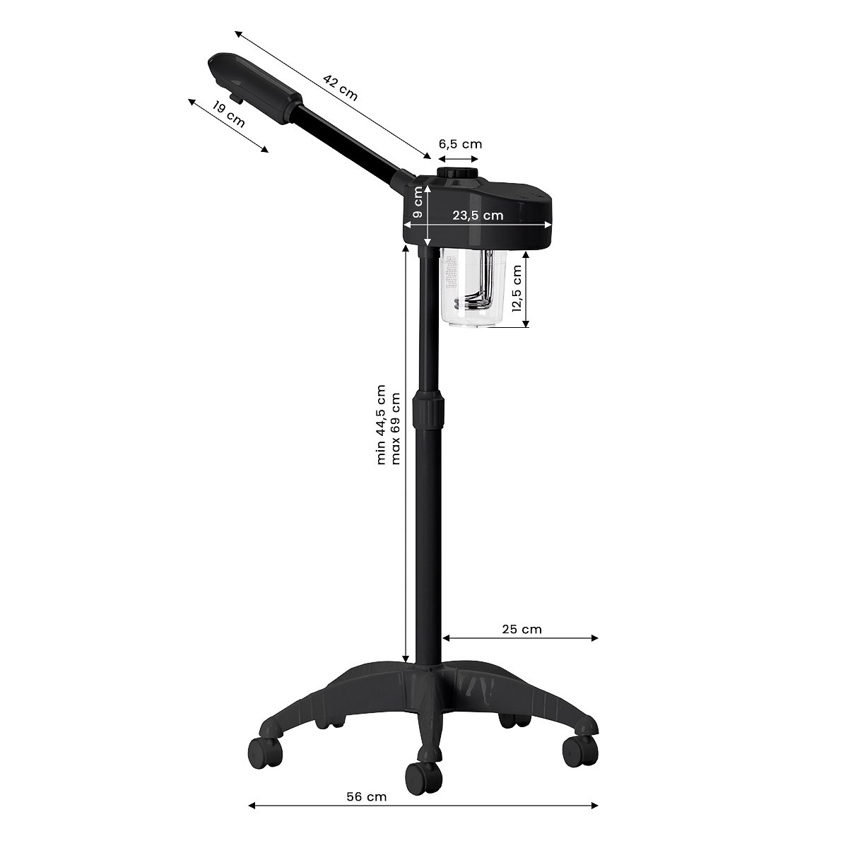 Giovanni ist eine Marke, die sich auf praktische Ausstattung für Kosmetikstudios und Kosmetikbetriebe spezialisiert hat und Produkte wie Kosmetikmöbel und Dampfgeräte anbietet. Die hohe Langlebigkeit, Ergonomie und Funktionalität der Produkte gewährleisten Komfort und Benutzerfreundlichkeit. Der multifunktionale Giovanni D-09 Dampfreiniger ist ein hervorragendes Gerät zur Optimierung von Schönheitsbehandlungen und eignet sich perfekt für jedes Kosmetikstudio. Er erzeugt Dampf, der die Haut mit Feuchtigkeit versorgt und erfrischt, die Poren öffnet und sie optimal auf weitere Behandlungen vorbereitet. Benutzerfreundlichkeit und Sicherheit: Der Dampfreiniger wurde mit Blick auf intuitive Bedienung und maximalen Komfort entwickelt. Für eine warme Dampfbehandlung füllen Sie einfach den Tank mit Wasser und halten die HOT-Taste gedrückt – das Heizelement erhitzt das Wasser, und nach wenigen Minuten tritt warmer Dampf aus. Durch erneutes Drücken der HOT-Taste wird diese Funktion deaktiviert. Die Ozonisierungsfunktion signalisiert Wassermangel, Verunreinigungen oder eine unzureichende Wassermenge mit einem akustischen Signal. Bei niedrigem Wasserstand im Tank schaltet sich der Dampfreiniger automatisch ab und gewährleistet so eine sichere Anwendung. Präziser Dampffluss und Ozonisierungsfunktion. Die Ozonisierungsfunktion des Dampfgeräts sorgt für eine effektive Hautreinigung durch die Erzeugung von aktivem Ozon, welches die therapeutische Wirkung des Dampfes verstärkt. Sie wird durch Gedrückthalten der LICHT-Taste aktiviert. Zum Beenden der Funktion halten Sie die Taste einfach erneut gedrückt. Ein weiterer Vorteil ist der frei drehbare Dampfkopf, der eine präzise Regulierung des Dampfstroms ermöglicht. Dank einfacher Bedienung und hoher Funktionalität ist das Gerät ideal für jedes Kosmetikstudio. Für welche Behandlungen eignet sich das Dampfgerät? Die Hauptfunktion des Geräts ist die effektive Reinigung und Befeuchtung der Haut. Das Dampfgerät erzeugt Dampf, der abgestorbene Hautzellen aufweicht, die Poren erweitert und die Blutgefäße öffnet. Dadurch wird die Haut optimal auf weitere kosmetische Behandlungen vorbereitet. Die Anwendung eines Dampfgeräts weicht die Hornschicht auf, was besonders wichtig für die Wirksamkeit von Reinigungsbehandlungen ist – es erleichtert die Entfernung von Mitessern und abgestorbenen Hautzellen. Es befreit die Talgdrüsen (die sogenannten Hautporen) und fördert so die Talgproduktion. Die Hautatmung und -durchblutung werden angeregt, wodurch Unreinheiten und Stoffwechselprodukte besser entfernt werden. Auch die Sauerstoffversorgung der Haut und die Nährstoffaufnahme bei nachfolgenden Behandlungen werden verbessert. Die Behandlung eignet sich auch für andere Körperpartien, die eine Tiefenreinigung benötigen – wie Hals, Dekolleté oder Rücken. Sie ist zudem wirksam für die Kopfhautpflege und Haarbehandlungen. Minimalismus und Funktionalität: Der Dampfreiniger ist aus robustem, schwarzem Kunststoff gefertigt und somit ideal für den täglichen Gebrauch. Er ist leicht zu reinigen. Der Ständer ist von 44,5 bis 69 cm höhenverstellbar, sodass Sie das Gerät auf die optimale Höhe einstellen und so maximalen Komfort gewährleisten können. Die drehbare Düse erweitert die Einstellmöglichkeiten. Der Fünf-Arm-Fuß mit Rollen sorgt für Mobilität und erleichtert das Bewegen des Geräts. Die genauen Maße entnehmen Sie bitte dem Foto. Im Lieferumfang enthalten: Dampfreiniger, Ständer mit Vier-Arm-Fuß und Gummirädern sowie eine Bedienungsanleitung.