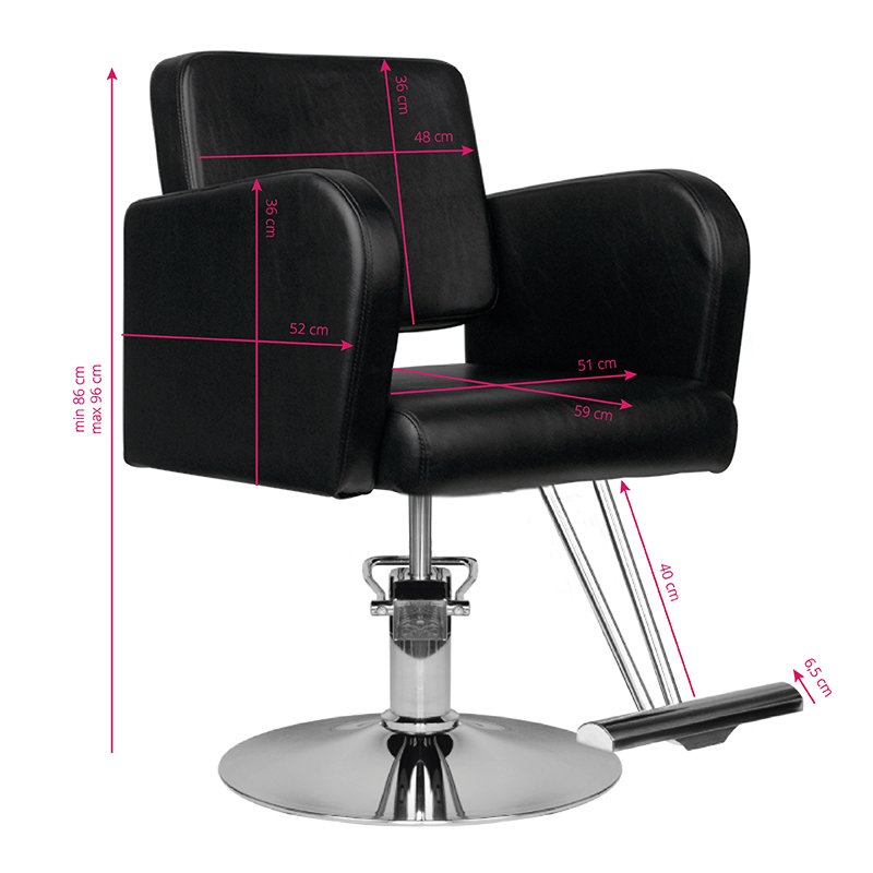 Ein moderner Friseurstuhl von HAIR SYSTEM. Elegant und äußerst komfortabel. Ein stabiles Chromgestell sorgt für sicheren Stand. Der Bezug besteht aus hochwertigem, schwarzem Kunstleder. Der Stuhl ist höhenverstellbar.