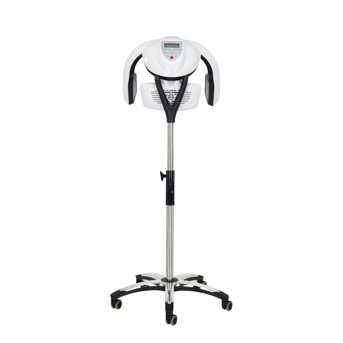 Gabbiano ist eine Luxusmarke für Friseurbedarf und -möbel, die sich durch Zuverlässigkeit, Qualität, ästhetische Verarbeitung und hohen Bedienkomfort auszeichnet. Das Unternehmen bietet eine große Auswahl an funktionaler Salonausstattung, darunter Stühle, Waschplätze und Infrarotzonen. Ein Gerät, das professionelles Arbeiten ermöglicht. Die professionelle Gabbiano Y-707 Stand-Infrarotzone ist ein unverzichtbares Gerät für Behandlungen wie Färben, Aufhellen, Pflegebehandlungen und Föhnen sowie für Dauerwellen und andere Dienstleistungen, die hohe Temperaturen erfordern. Das Gerät verkürzt die Behandlungsdauer deutlich, sodass mehr Kunden bedient werden können, ohne die hohe Qualität der Salonleistungen zu beeinträchtigen. Übersichtliches Bedienfeld. Die elektronische Parametereinstellung vereinfacht die Arbeit des Friseurs erheblich. Das Gerät ist mit einem intuitiven Bedienfeld mit übersichtlichem LCD-Display ausgestattet, das eine einfache Bedienung gewährleistet. Es ermöglicht ein effizientes Umschalten zwischen verschiedenen Betriebsmodi. Sie können zwischen automatischen Betriebsmodi wechseln, die Stärke jedes der fünf Luftströme, die Temperatur (im Bereich von 50–80 °C) und die Behandlungsdauer (zwischen 1 und 60 Minuten) individuell einstellen. Dies verbessert die Leistung verschiedener Behandlungen spürbar. Verfügbare Betriebsmodi: Der Betriebsmodus lässt sich individuell an Ihre Bedürfnisse anpassen. Alternativ können Sie eine von fünf vorprogrammierten Optionen nutzen, die speziell für Trocknen, Färben, Pflegen, Strähnchen und Dauerwellen entwickelt wurden. Jede dieser Optionen verfügt über speziell abgestimmte Einstellungen, um die Wirksamkeit der Behandlungen zu maximieren. Die Verwendung des Geräts beschleunigt den Färbeprozess deutlich, gewährleistet eine optimale Aufnahme von Pflegeprodukten und garantiert eine längere Farbbeständigkeit. Das Gerät ist die perfekte Ergänzung für die Ausstattung jedes Friseursalons und optimiert die Durchführung einer Vielzahl von Dienstleistungen erheblich. Schlichtes, funktionales Design: Das futuristische Gehäuse aus robustem Kunststoff in Weißtönen verleiht dem Gerät ein modernes und einzigartiges Aussehen und fügt sich harmonisch in die meisten Salons ein. Der Fuß des Infrazone-Geräts ist ein fünfarmiges Spinnengestell. Das Gerät ist mit Rollen für mehr Mobilität und einem von 135 bis 176 cm verstellbaren Stativ ausgestattet, was ein komfortables Arbeiten ermöglicht und das Gerät an verschiedene Bedürfnisse anpasst. Die Abmessungen des Geräts sind auf dem Foto dargestellt. Daten: Farbe: Weißtöne; Temperaturregelung: 50–80 °C; Fünf-Lüfter-System; Leistung: 1500–1800 W; Eingangsspannung: 220–240 V