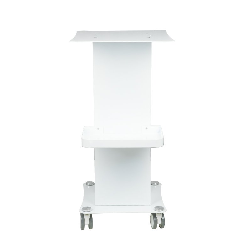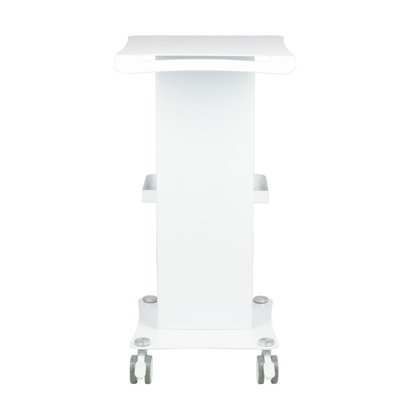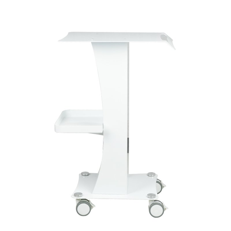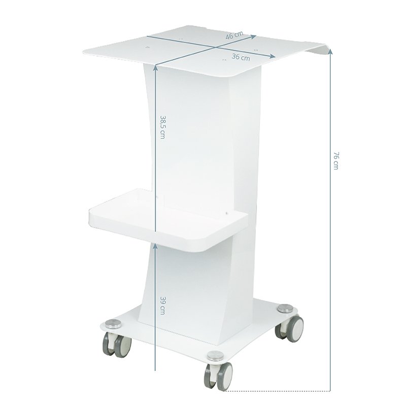 Ein funktionaler Metalltisch mit feststellbaren Gummirollen. Er eignet sich perfekt als Ablage für Kosmetikgeräte. Er verfügt über eine stabile Ablage für das Gerät und eine weitere für Zubehör. Dank der Rollen ist der Tisch mobil und leicht zu bewegen. Dieses Möbelstück sorgt für Komfort und Bequemlichkeit beim Arbeiten.