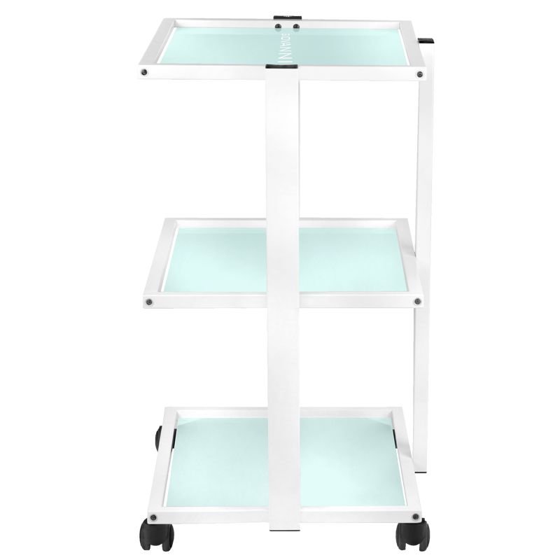 Kosmetiktisch 1040. Ästhetischer Kosmetiktisch aus Metall und Glas mit Gummirädern. Er verfügt über drei Glasablagen mit eingraviertem GIOVANNI-Logo. Eine Lupenleuchte kann angebracht werden.