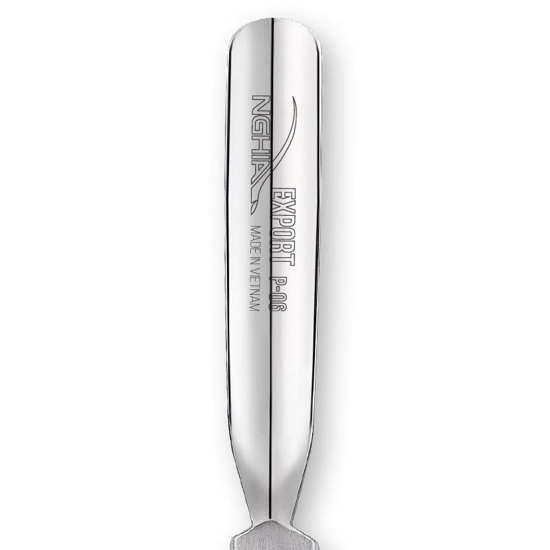 NGHIA EXPORT P-06 Nagelhautschieber für Maniküre/Pediküre. Dieses Werkzeug dient zum Zurückschieben fest anhaftender Nagelhaut vom Nagelbett. – Hergestellt aus leicht mattiertem Edelstahl (INOX), wie er auch in der Herstellung chirurgischer Instrumente verwendet wird. – Mit einer 9 mm breiten, rinnenförmigen Spitze. – Desinfizierbar und sterilisierbar mit allen Methoden (chemisch, thermisch, chemisch-thermisch). – Gesamtlänge des Schiebers: 14,4 cm. – Gewicht: 25 g. DIESES WERKZEUG IST AUTOKLAVE-STERILISATION UND CHEMISCHE DESINFEKTION GEEIGNET.* * AUTOKLAVE – GRUNDSTERILISATIONSTEMPERATUR: 121 °C FÜR 15 MIN., DEAKTIVIERUNGSTEMPERATUR: 132–134 °C, DRUCK: 3 BAR. ACHTUNG!!! Stahl, auch Edelstahl, kann unabhängig vom Hersteller unter bestimmten Bedingungen beschädigt und zerstört werden, was zu Verfärbungen, Lochfraß oder sogar Korrosion führen kann. *Chemische Desinfektion – mit einer dafür vorgesehenen Flüssigkeit gemäß den Herstellerempfehlungen. Warnung!!! Die Nichtbeachtung der Herstellerempfehlungen (zu starke Lösung, zu lange Desinfektionszeit) kann zu einer Reaktion des Metalls führen, die Verfärbungen und Beschädigungen des Werkzeugs verursacht.