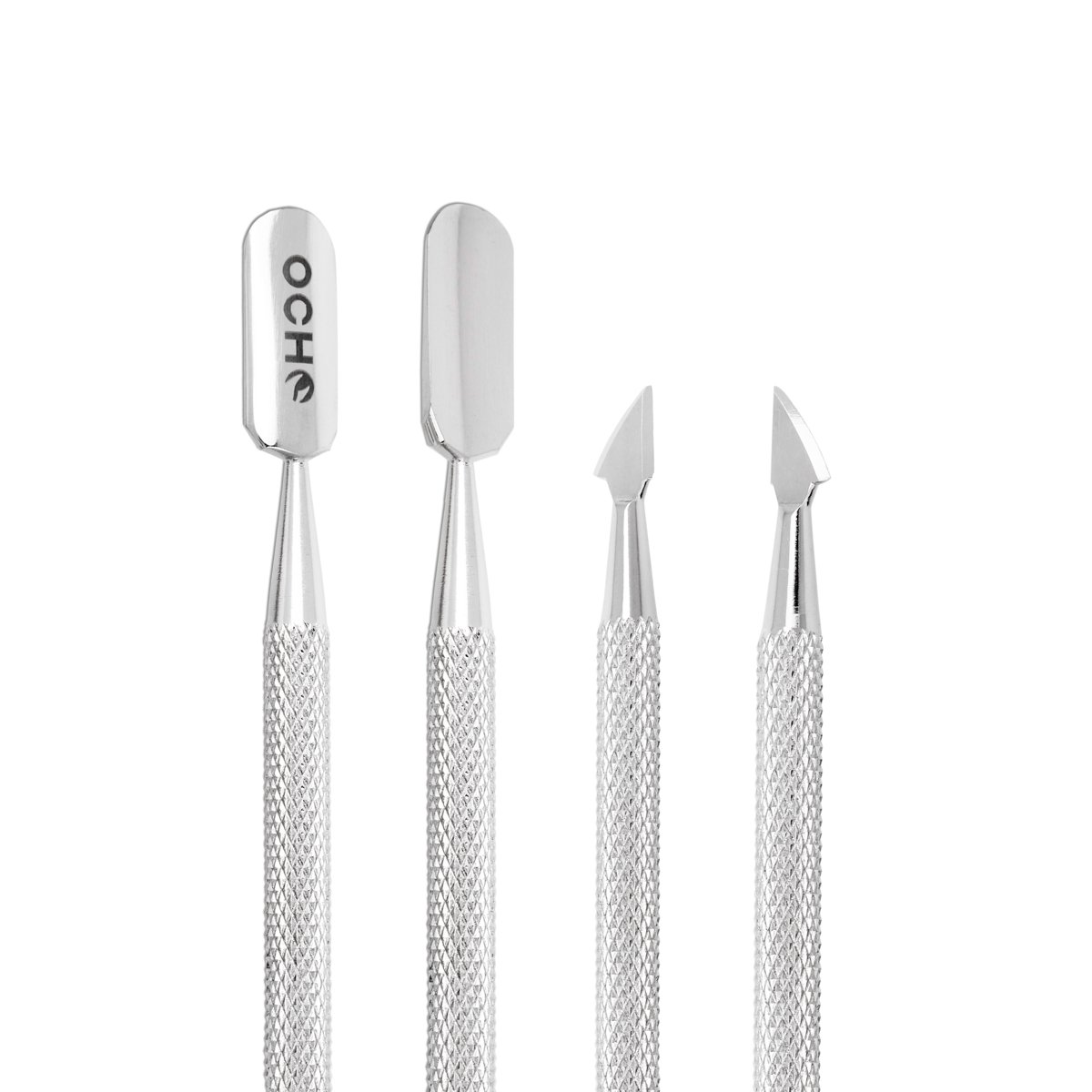 OCHO PRO ist eine einzigartige Marke, die hochwertige Werkzeuge für die Beauty-Branche anbietet. OCHO PRO hat sich zum Ziel gesetzt, Werkzeuge zu entwickeln und kontinuierlich zu verbessern, die Behandlungen und die tägliche Pflege erleichtern. Dieser Nagelhautschieber eignet sich perfekt für Maniküre und Pediküre. Er dient zum Peelen der Haut und entfernt effektiv Nagelhaut, Nagelbett sowie Gel- und Acrylreste von der Nagelplatte. Er ist ergonomisch geformt, liegt angenehm in der Hand (wie ein Stift) und besticht durch sein ansprechendes Design. Verschiedene Merkmale unterstreichen die hohe Qualität des Produkts: Er ist aus speziellem Edelstahl gefertigt, der auch für chirurgische Instrumente verwendet wird. Er verfügt über zwei unterschiedliche Enden (ein flaches, doppelseitiges Messer und ein abgerundetes, konvexes). Der geriffelte Griff sorgt für sicheren Halt. Er ist autoklavierbar und chemisch desinfizierbar. Länge: 12 cm, Länge der Spitze mit Schneide: 8 mm, Länge der abgerundeten, konvexen Spitze: 19 mm
