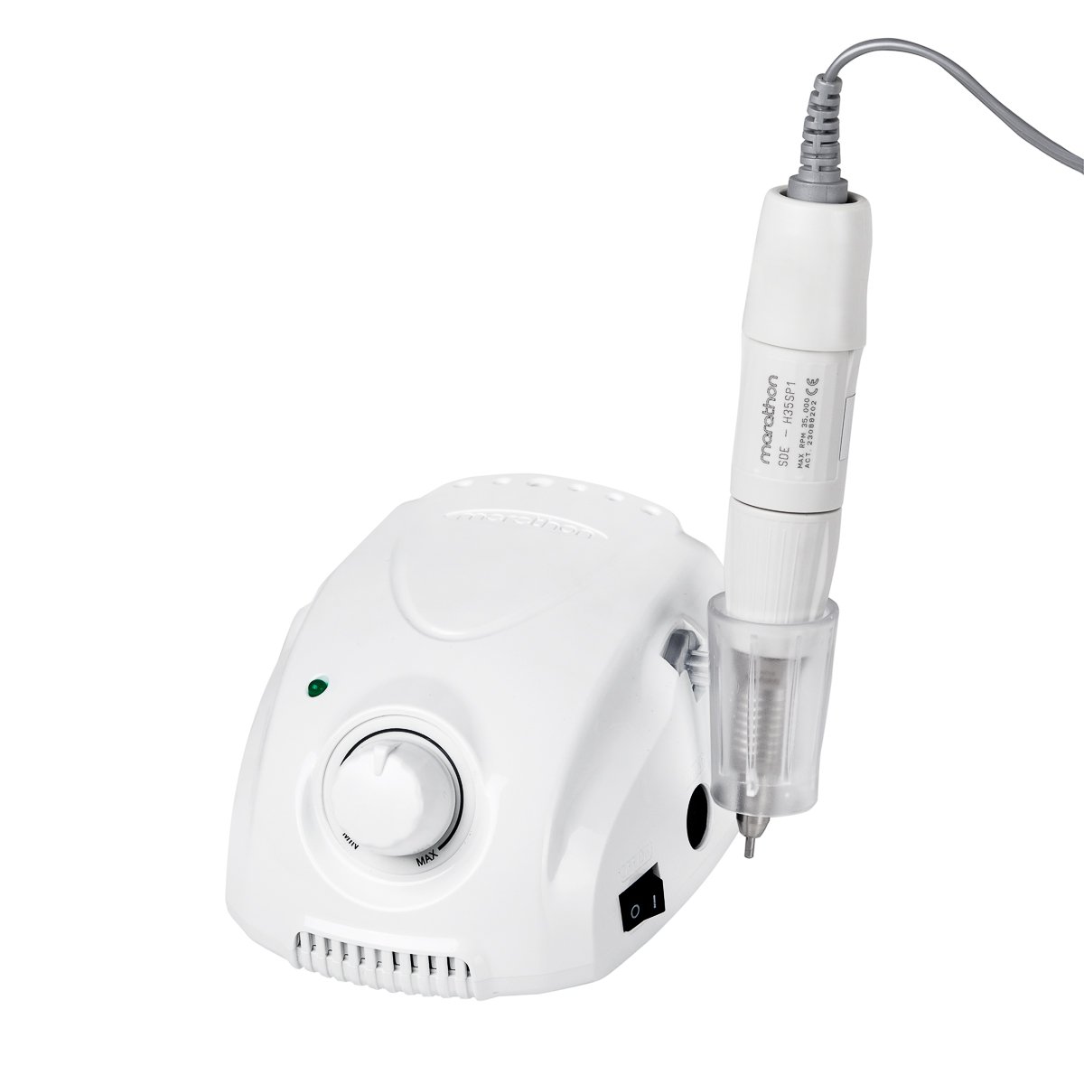 Technische Daten: Gehäusefarbe: Weißtöne, Drehzahl: 35.000 U/min, Fräskopf mit Drehverschluss, Netzteil: kabelgebunden, Leistung: 45 W, Eingangsspannung: 110–240 V,
