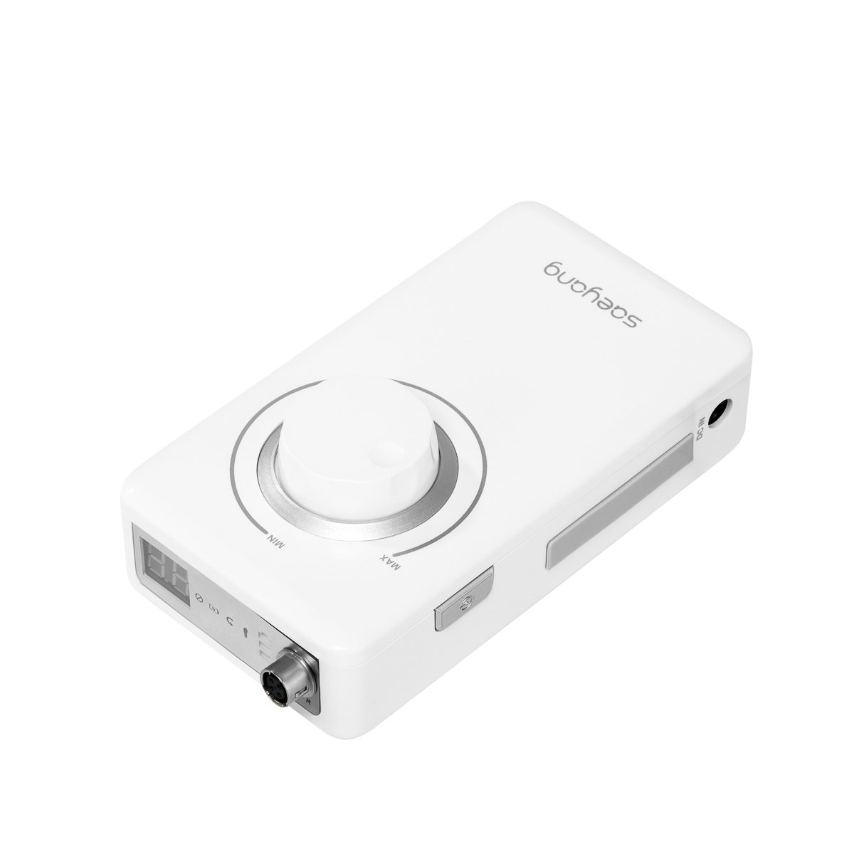 Die Marke Saeyang bietet hochwertige Werkzeuge für professionelle Maniküre- und Pedikürebehandlungen. Die von Kosmetikerinnen geschätzten Saeyang-Produkte zeichnen sich durch exzellente Verarbeitung, Präzision und innovative Lösungen aus. Die perfekte Fräsmaschine für mobile Dienstleistungen: Die kompakte, kabellose Saeyang Marathon K38 PRO mit bürstenlosem Motor ist ein praktisches Gerät, ideal für mobile Nageldesignerinnen. Sie erleichtert die Vorbereitung von Nägeln und Nagelhaut und schafft so die ideale Basis für weitere Designs. Mit einer Akkuladung ermöglicht sie bis zu 8 Stunden komfortables Arbeiten. Bürstenloser BS30-Fräskopf: Der schlanke BS30-Fräskopf liegt angenehm in der Hand und ermöglicht komfortables und präzises Arbeiten. Dank optimaler Balance und deutlich reduzierter Vibrationen ermüdet die Hand nicht so schnell, sodass auch längere Behandlungen möglich sind. Das benutzerfreundliche Twist-Lock-System ermöglicht einen schnellen und einfachen Fräserwechsel. Die Bedienung des Geräts ist dadurch besonders einfach und intuitiv – ein Vorteil, den auch anspruchsvolle Anwenderinnen zu schätzen wissen. Digitalanzeige und LED-Anzeigen: Mit einem Drehknopf lässt sich die Drehzahl des Fräskopfes bis zu 35.000 U/min einstellen. Dies ermöglicht eine effiziente Anpassung an individuelle Bedürfnisse und somit eine komfortable Durchführung einer Vielzahl von Behandlungen. Praktische Tasten an den Seiten erlauben das einfache Umschalten auf Fußantrieb, das Anhalten des Geräts (Pause-Funktion) und das Ändern der Drehrichtung. So haben Sie die volle Kontrolle über die Fräsmaschine und können sie optimal an Ihre Bedürfnisse anpassen. LED-Anzeigen informieren Sie über den Gerätestatus – Drehrichtung, Akkustand, Aktivierung des Fußantriebs und Pause. Das Gerät ist mit einem Überlastungsschutz ausgestattet. Die Fräsmaschine arbeitet leise und sorgt so für Komfort für Anwender und Kunden. Der integrierte 2850-mAh-Akku ermöglicht eine Betriebsdauer von bis zu 8 Stunden mit einer einzigen Ladung. Zusätzlich verfügt das Gerät über einen automatischen Energiesparmodus, der den Akku schont. Das ergonomische Design mit praktischer Tastenanordnung und intuitiver Bedienung gewährleistet einen reibungslosen Behandlungsablauf. Ästhetisch ansprechendes, kompaktes Gerät. Das minimalistische, weiße Kunststoffgehäuse gewährleistet Langlebigkeit und einfache Reinigung und ist eine optisch ansprechende Ergänzung für jeden Arbeitsplatz. Dank seiner kompakten Abmessungen und des geringen Gewichts eignet sich die Fräsmaschine ideal für kleine Arbeitsplätze und den Transport – besonders praktisch für mobile Dienstleistungen. Für mehr Stabilität ist das Gerät mit rutschfesten Gummielementen an der Unterseite ausgestattet, die ein sicheres und komfortables Arbeiten gewährleisten. Im Lieferumfang enthalten sind: Fräsbasis, Fräskopf, Netzteil, Silikon-Stativ für den Fräskopf und Bedienungsanleitung.