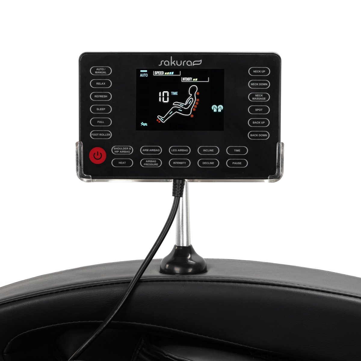 Sakura Massagesessel bieten Entspannung und hohen Komfort. Sie sind ideal, um etwas für Ihre Gesundheit und Ihr Wohlbefinden zu tun. Dank vielfältiger Funktionen und einfacher Bedienung eignen sie sich hervorragend für Massagestudios und den Heimgebrauch. Mit viel Liebe zum Detail gefertigt, fügen sie sich harmonisch in jedes Ambiente ein. Umfassende Massage für vollkommene Entspannung. Der Sakura Standard 801 Massagesessel ist mit zahlreichen Funktionen für eine umfassende Massage und ein erstklassiges Nutzererlebnis ausgestattet. Rückenmassageköpfe und Luftkissen garantieren tiefe Muskelentspannung, fördern die Durchblutung, lindern Muskelermüdung und reduzieren Stress. Übersichtliches Bedienfeld mit LCD-Bildschirm. Das gut lesbare Bedienfeld macht die Bedienung des Sessels einfach und angenehm. Für mehr Komfort kann es am Griff der rechten Armlehne angebracht oder in der Hand gehalten werden. Über den übersichtlichen LCD-Bildschirm haben Sie alle wichtigen Informationen im Blick. Er zeigt übersichtlich die massierten Körperbereiche, die Intensität, die Behandlungsdauer und das gewählte Programm an. Über das Bedienfeld können Sie ein Massageprogramm auswählen, die Funktionen des Sessels und der Massage individuell anpassen, die Intensität regulieren und die Behandlungsdauer (15, 20, 25 oder 30 Minuten) einstellen. Automatische Programme decken die gängigsten Bedürfnisse ab. Der Sessel verfügt über vier vorprogrammierte Automatikprogramme mit vielfältigen Effekten. Diese wurden speziell auf die Bedürfnisse aller Nutzer abgestimmt. Sorgfältig ausgewählte Sequenzen nutzen die einzelnen Funktionen des Sessels – Bewegungen des Massagekopfes, Airbag-Aktivität, Neigungswinkel und Heizfunktion. Wählen Sie je nach gewünschter Wirkung einfach den passenden Modus am Bedienfeld: